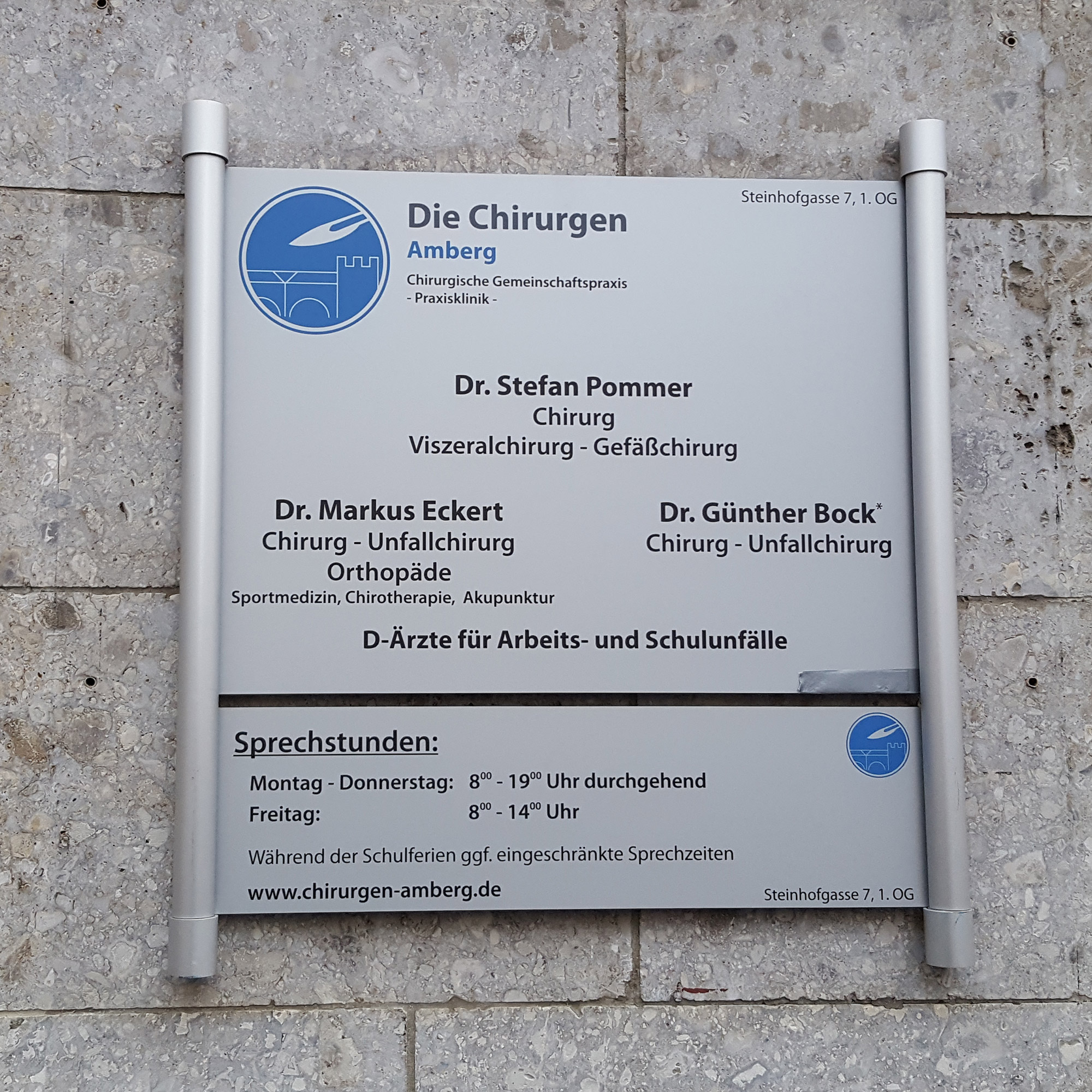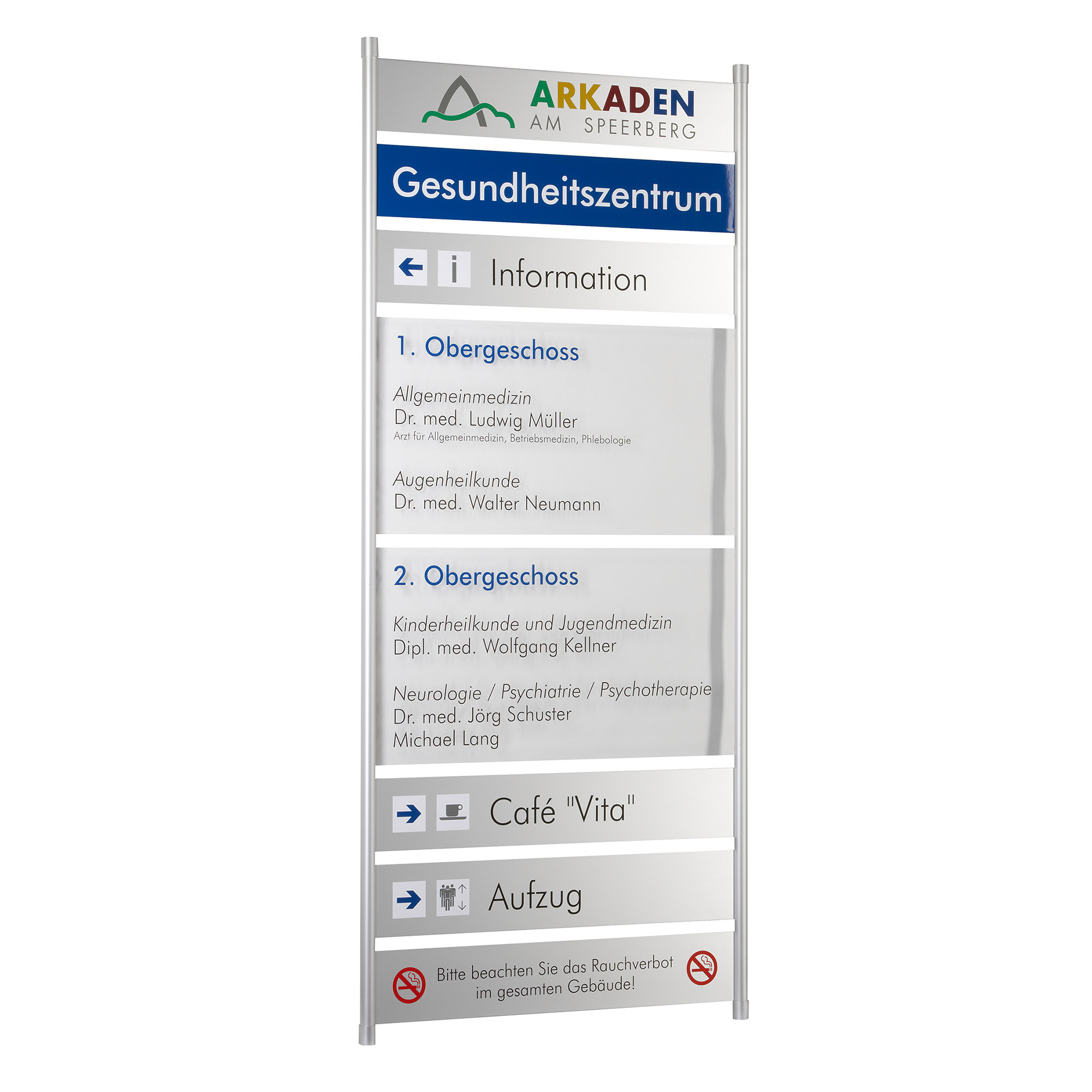 Ein BERLIN Schildträgersystem besteht aus 2 Trägerprofilen und 4 Wandhalterungen aus eloxiertem Aluminium sowie 4 Abdeckkappen und Spreiznieten.